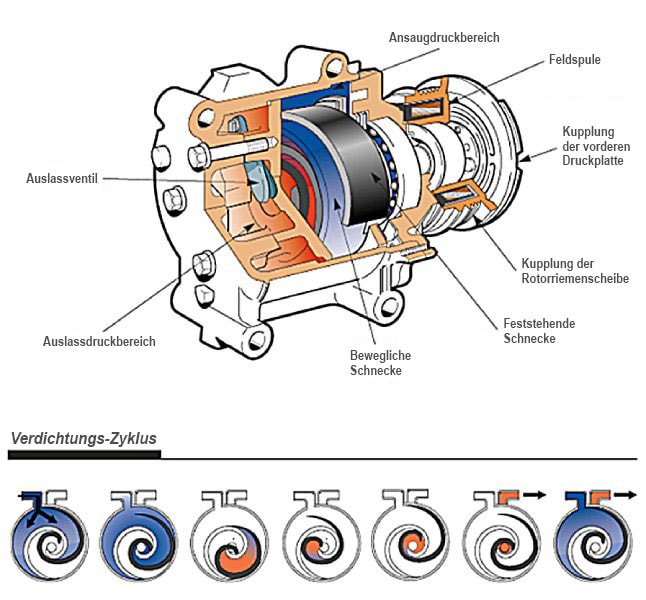 Der Kompressor der Klimaanlage ist das Herzstück des Kühlsystems und fungiert als Ansaug-, Kompressions- und Umwälzpumpe. Der Kompressor kann als Schnittstelle zwischen der Niederdruckseite und der Hochdruckseite des Kältemittelkreislaufs betrachtet werden. Das Kältemittel wird von der Niederdruckseite angesaugt und verdichtet, um die Temperatur und den Druck zu erhöhen, und dann in die Hochdruckseite gepumpt, um sich hin und her zu bewegen.
